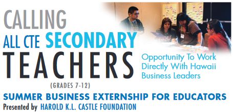 - 2017 Summer Externship for CTE Educators [VIEW FLYER] - Opportunity to work directly with Hawaii business leaders and learn the latest industry trends, job skills and competencies needed in the workplace. For grades 7-12 CTE educators.
